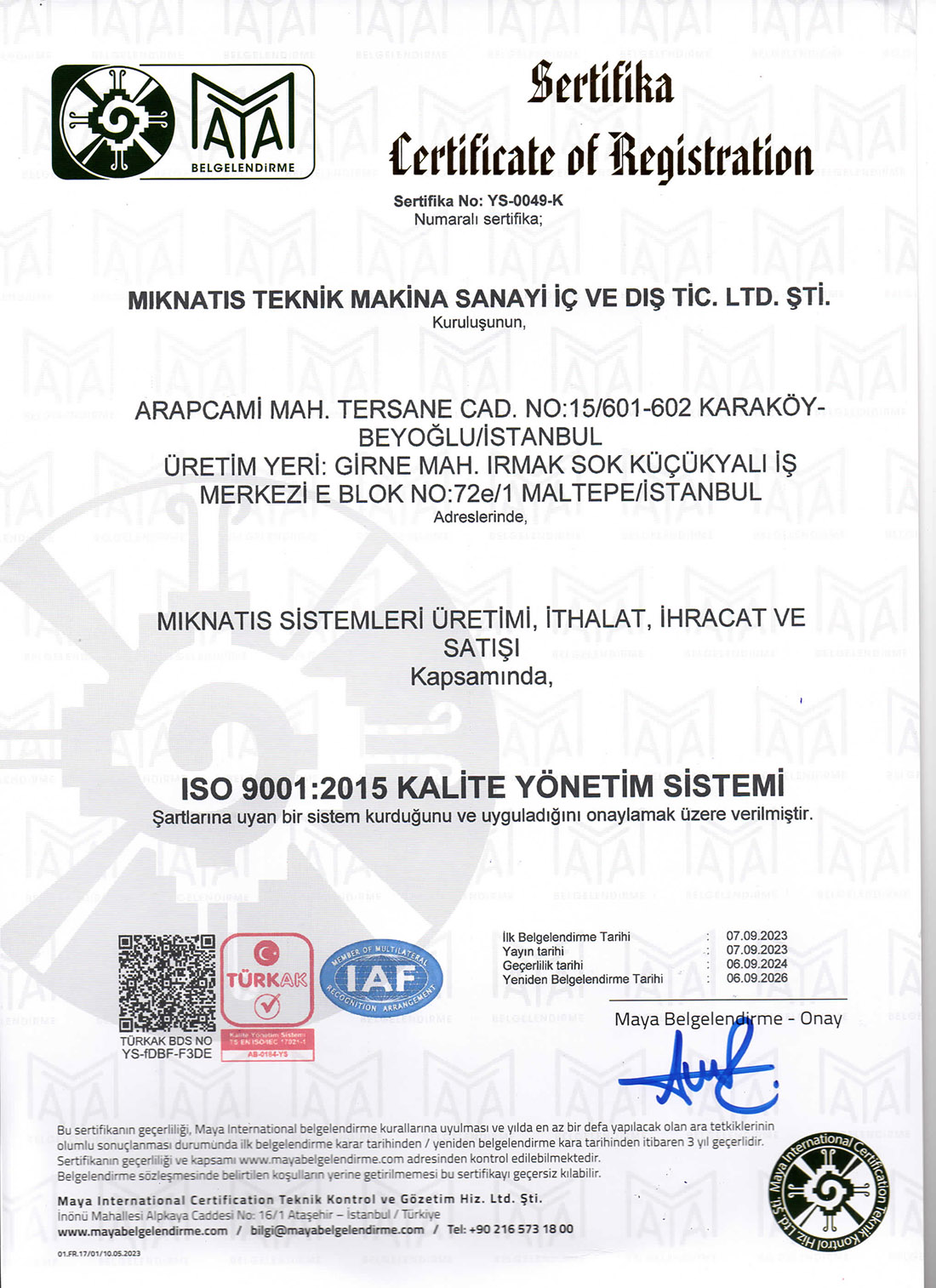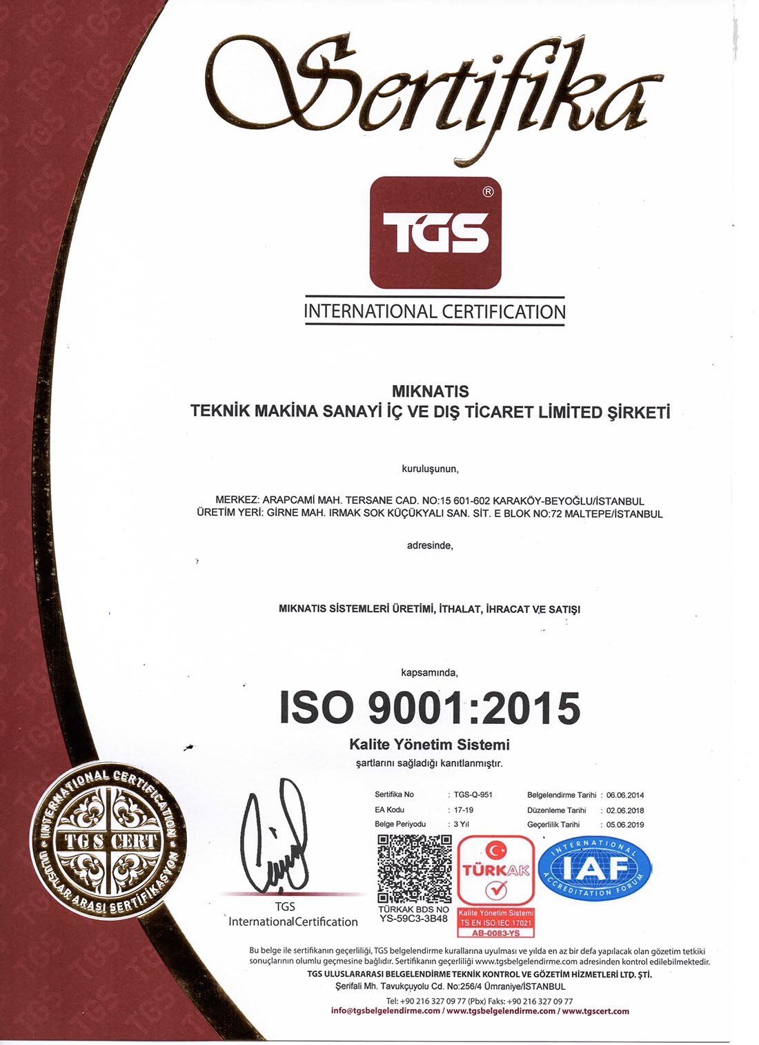 Kalite Yönetim Sistemi belgesini TÜV'den alarak, Uluslararası Standardizasyon Örgütünün oluşturduğu kalite yönetim standartlarına ulaşmış olduk. "Bu belge Müşterilerine ve topluma daha fark edici hizmet sunmasının karşılığıdır"